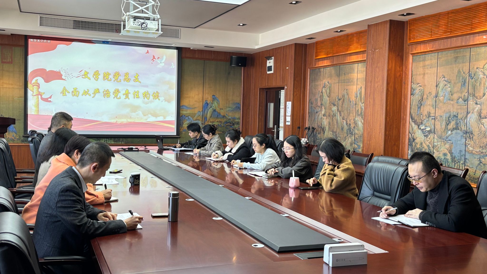 11月11日,文学院党总支召开集体约谈会,传达落实学校纪委关于全面从严治党的工作要求。学院班子成员、党总支委员、党支部书记、专职组织员及各系(室)负责人参加会议。