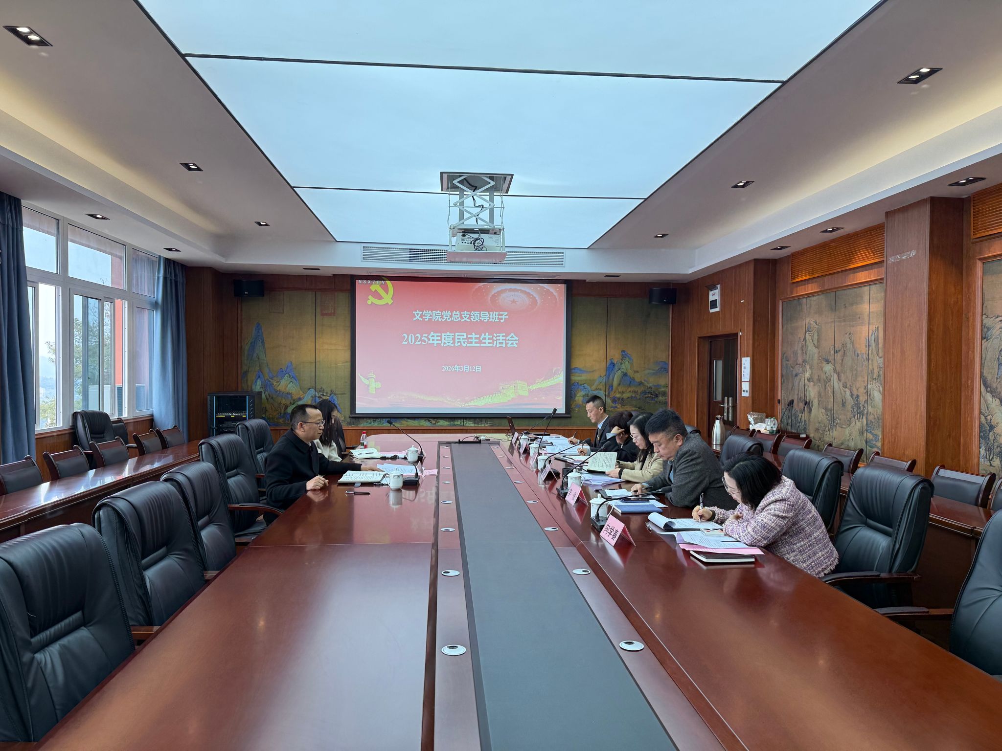 为深入学习贯彻习近平新时代中国特色社会主义思想,全面贯彻落实党的二十届四中全会精神,深入贯彻中央八项规定精神学习教育成果,3月12日下午,文学院党总支在博学楼3-404会议室召开2025年度党员领导干部民主生活会。学校党委常委、副校长郭作飞到会指导并讲话,学院班子党员领导干部参加会议。学院非中共党员领导干部、专职组织员及纪检监察室相关干部列席会议。会议由学院党总支书记唐晓萍主持。