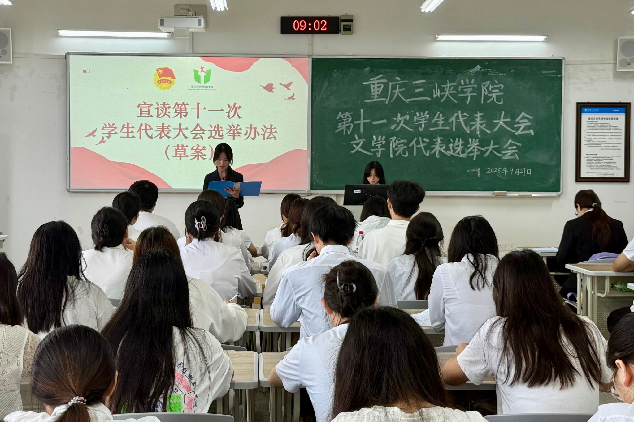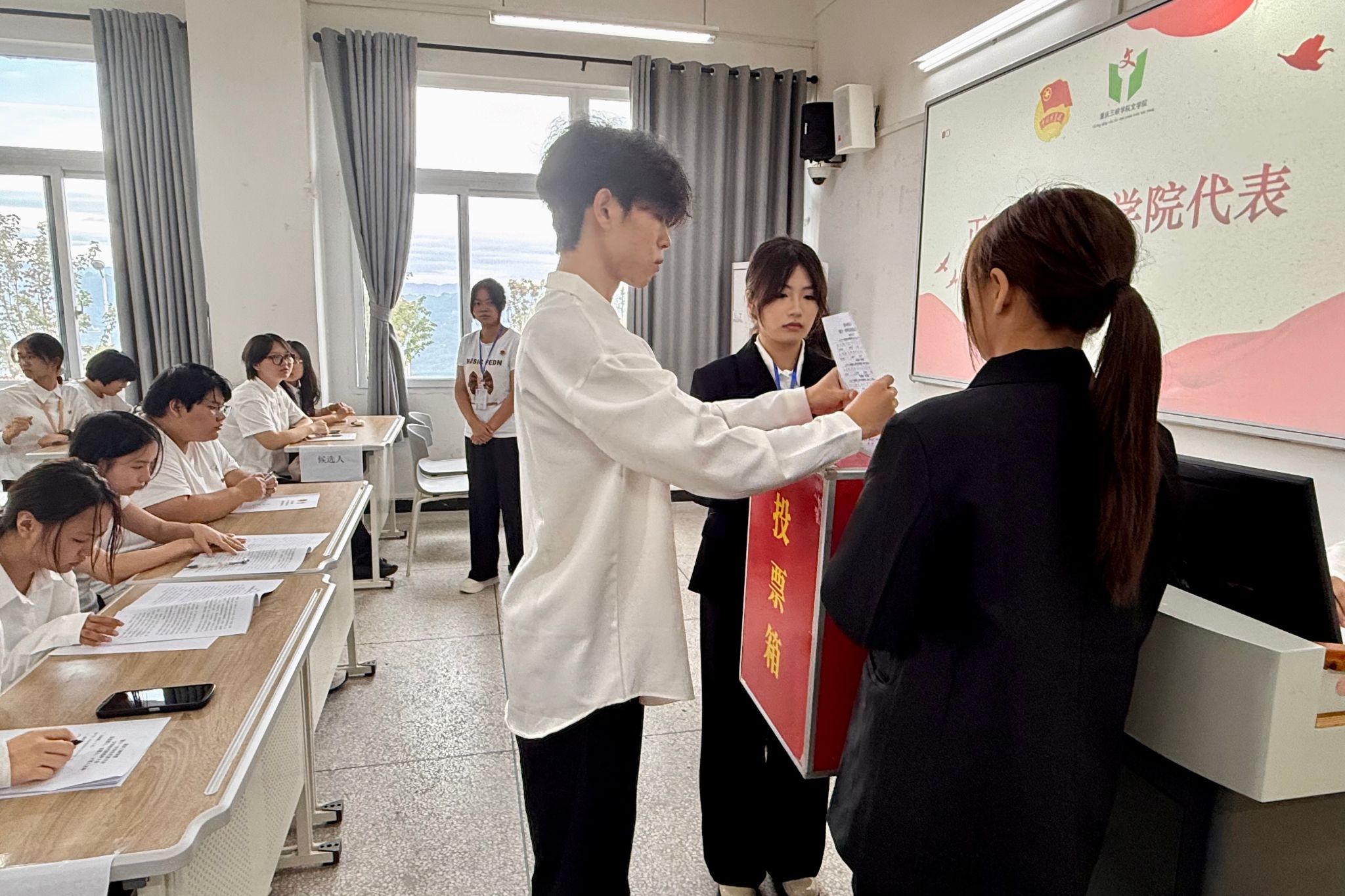 会议第一项,奏唱中华人民共和国国歌。会议第二项,秘书处部长盛严锐宣读《重庆三峡学院第十一次学生代表大会文学院代表选举大会选举办法(草案)》,经全体代表审议后全票通过。会议第三项,秘书处部长沈汧卉从学业成绩、综测情况、工作经历等方面详细介绍了文学院代表候选人基本情况。会议第四项,正式选举文学院代表。在监票人监督下,全体选举人慎重投票,计票人严谨计票。会议第五项,主持人宣布文学院代表选举大会选举名单,共选出11名学生代表。会议第六项,正式选举文学院常任代表,选举过程公开、计票严谨。会议第七项,主持人根据投票宣布计票结果。