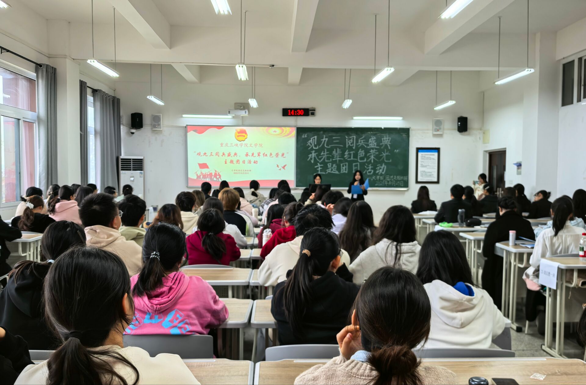 为深切缅怀革命先辈的丰功伟绩,深刻领悟抗日战争壮阔历史的非凡意义与抗战胜利的伟大荣光,文学院于10月23日在博学楼1栋103室成功举办了“观九三阅兵盛典,承先辈红色荣光”主题团日活动。文学院学生团体联合会主席陈沛洁、学生会主席团成员汤雨欣、大学生语言艺术爱好者协会副会长陈秋瑾、组织部部长张金羽出席活动,担任嘉宾评委。