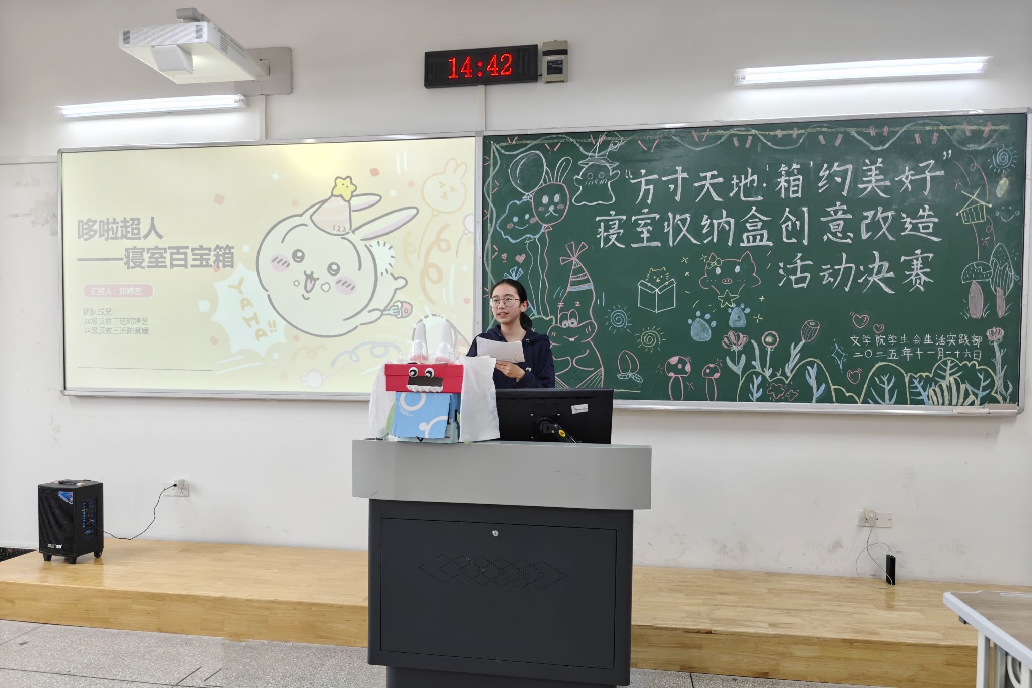 为优化寝室空间、倡导绿色生活、激发同学们的创意与动手能力,11月16日,文学院于百安校区博学楼1栋105室举办“方寸天地·‘箱’约美好”寝室收纳盒创意改造大赛。本次活动由文学院生活实践部组织,邀请学生会主席团成员汤雨欣和何倩、勤工外联部部长喻稚涵、学习部部长刘雨佳担任评委。