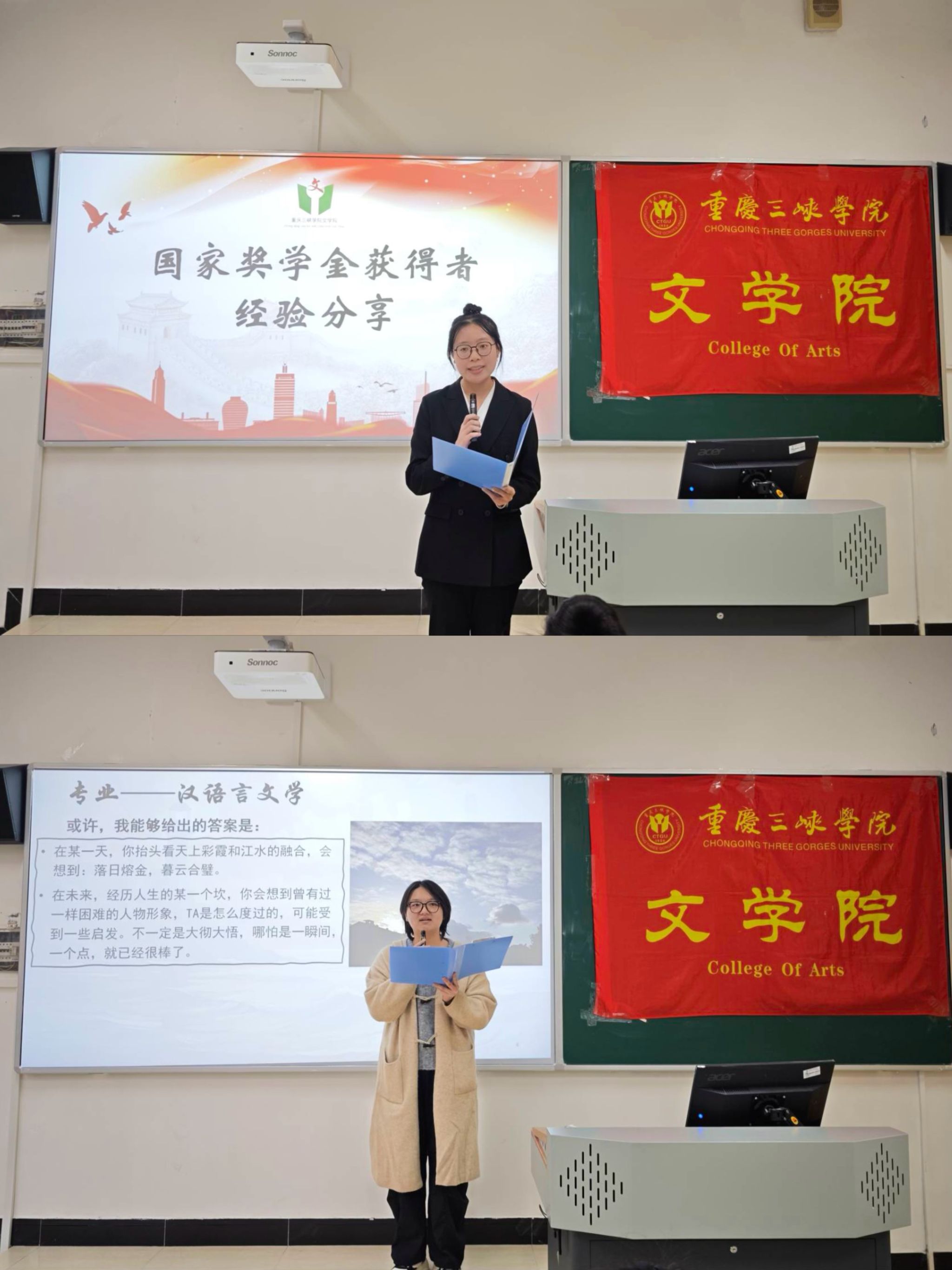为充分发挥国家奖学金获得者的榜样示范作用,激励广大学子勤奋学习、砥砺前行,11月30日,文学院在沙龙校区综合教学楼106室举办国家奖学金优秀学子报告会。国家奖学金获得者陈沛洁、王莎、聂冰、何思源作为优秀学子代表分享经验。